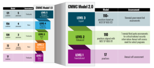 CMMC 1.0 was structured around five levels, including two transition levels. In CMMC 2.0, the DoD removed those two transition levels, simplifying the structure to: “Foundational” (previously Level 1), “Advanced” (previously Level 3), and “Expert” (previously Level 5).